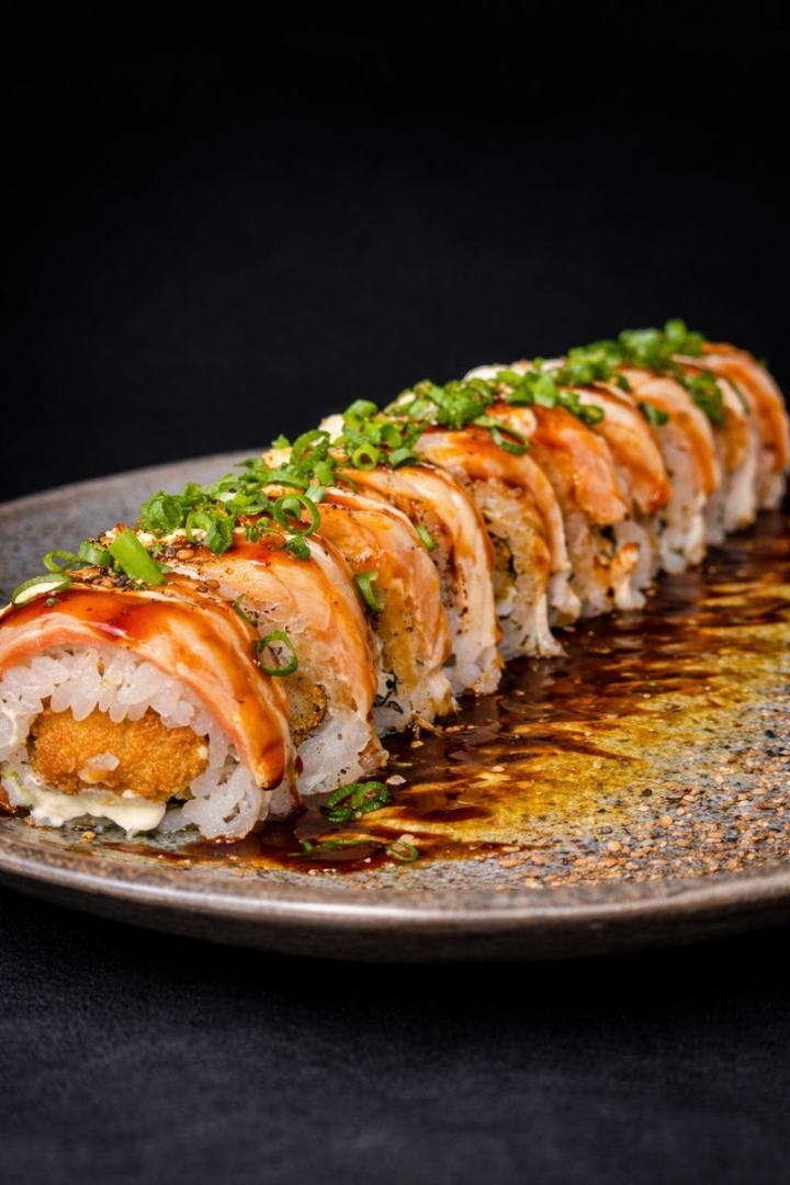Uramaki de Tilápia empanada, cream chesse e finalizado com uma lâmina de salmão maçaricado, geléia de pimenta, tarê e cebolinha.