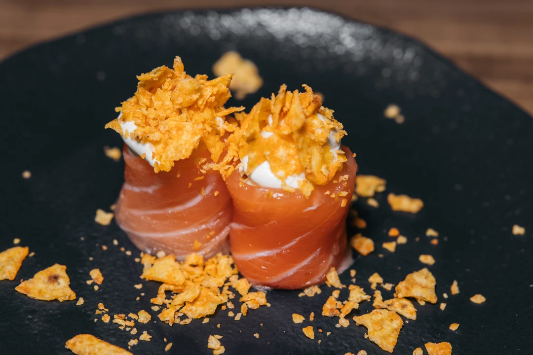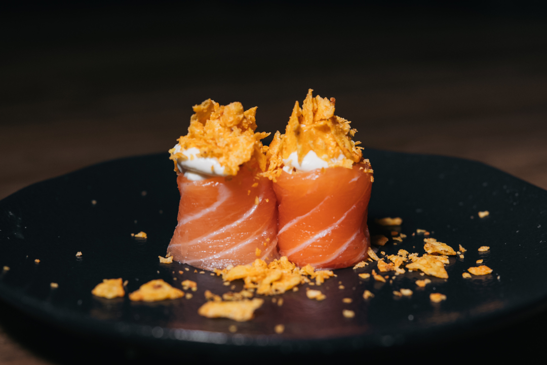 Cada Gunkan é cuidadosamente envolvido por uma lâmina de salmão, coroada com uma generosa porção de cream cheese e finalizadas com Doritos.