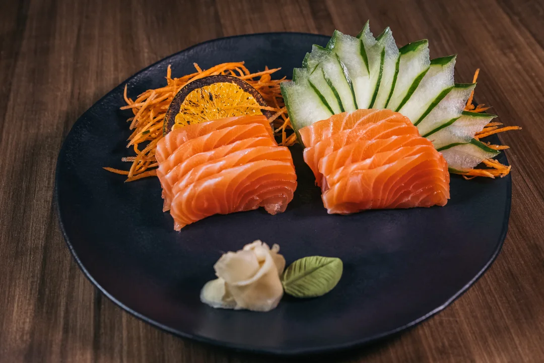 Sashimi de Salmão fresco, fatiado em 10 peças selicionadas. Peça já esta iguaria! 🎁 Enviamos wasabi, gengibre, dois sachês de shoyu + dois pares de hashi sem custo adicional.