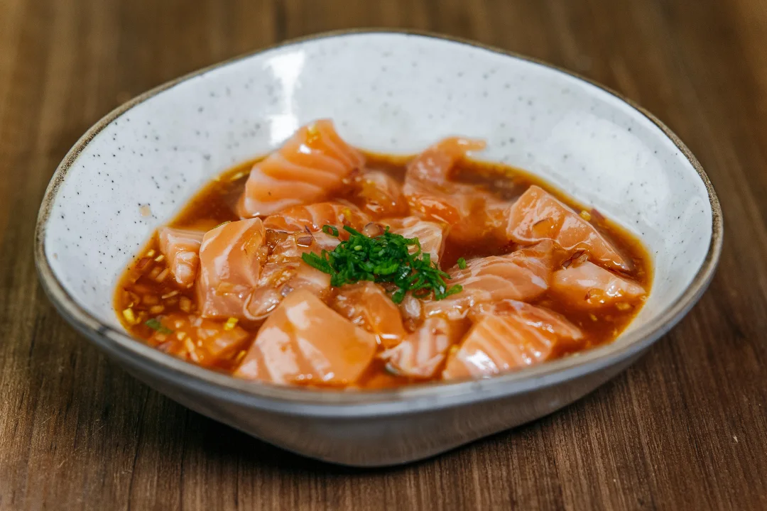 - 150 g de salmão fresco em cubos marinado no molho de ostras, limão e laranja