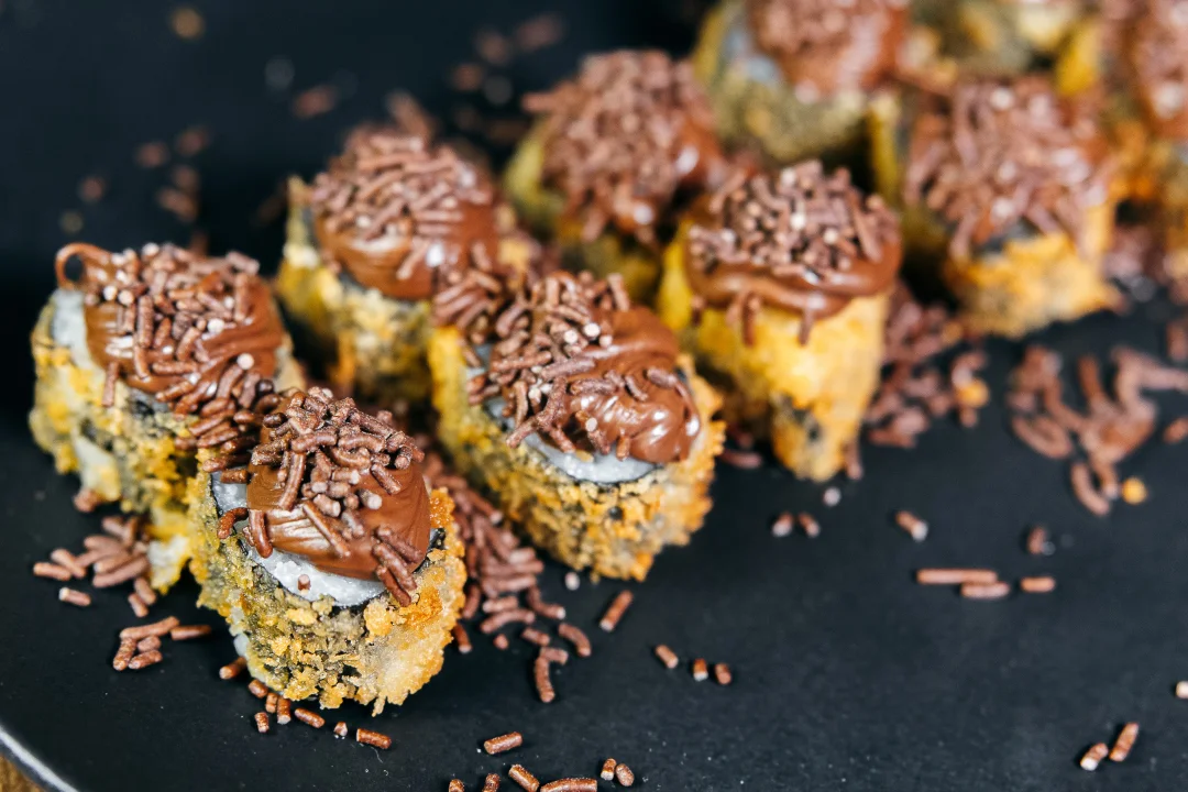 Uma sobremesa empanada em farinha Panko, coberto por uma generosa camada de Nutella e finalizado com uma crocante farofa de paçoca e um toque suave de leite condensado, criando uma mistura de texturas e sabores irresistível. Peça agora mesmo! Acompanha 2 pares e hashi e 2 sachês de shoyu.