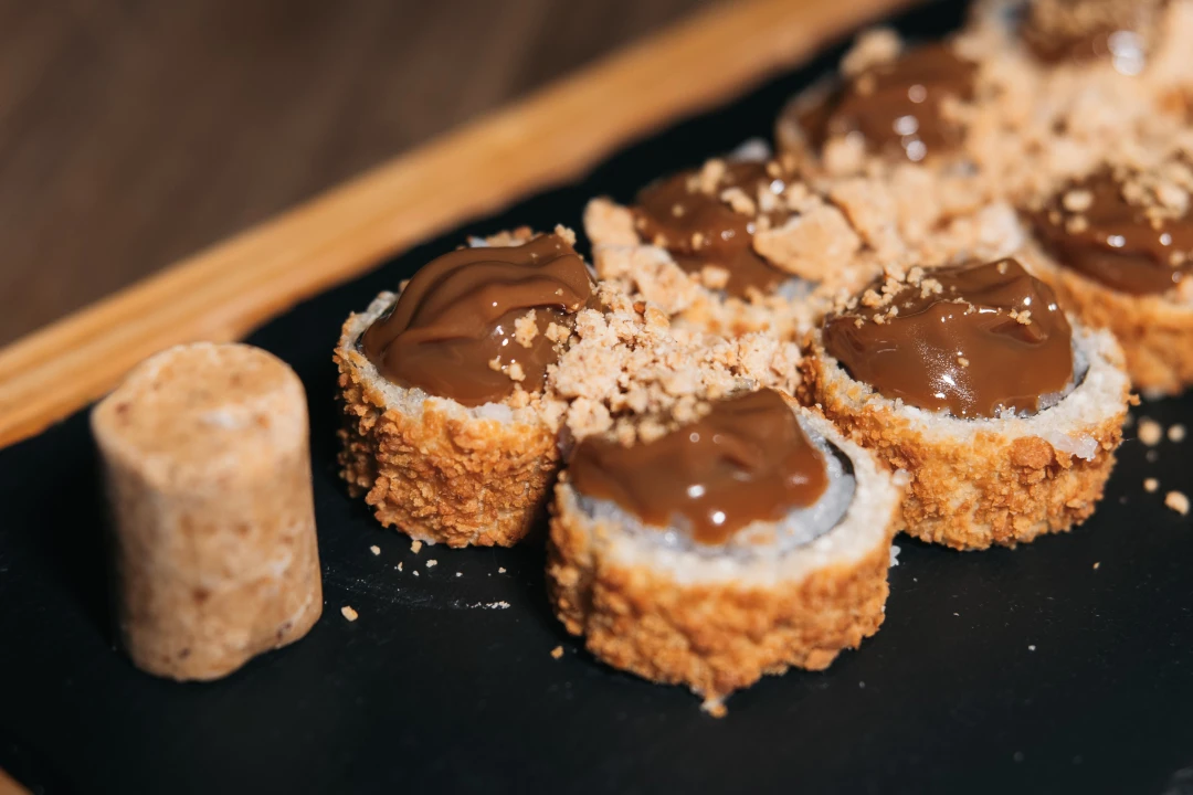 Uma sobremesa empanada em farinha Panko, coberto por uma generosa camada de Nutella e finalizado com uma crocante farofa de paçoca e um toque suave de leite condensado, criando uma mistura de texturas e sabores irresistível. Peça agora mesmo! Acompanha 2 pares e hashi e 2 sachês de shoyu.