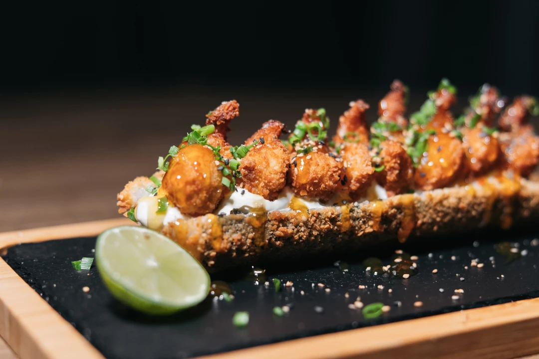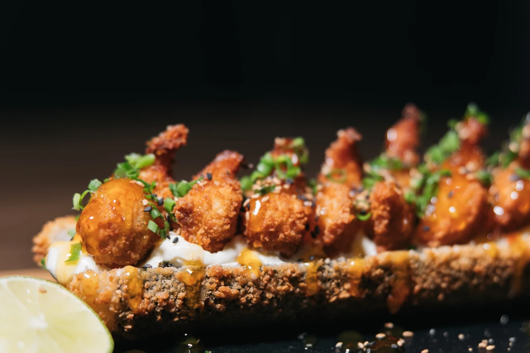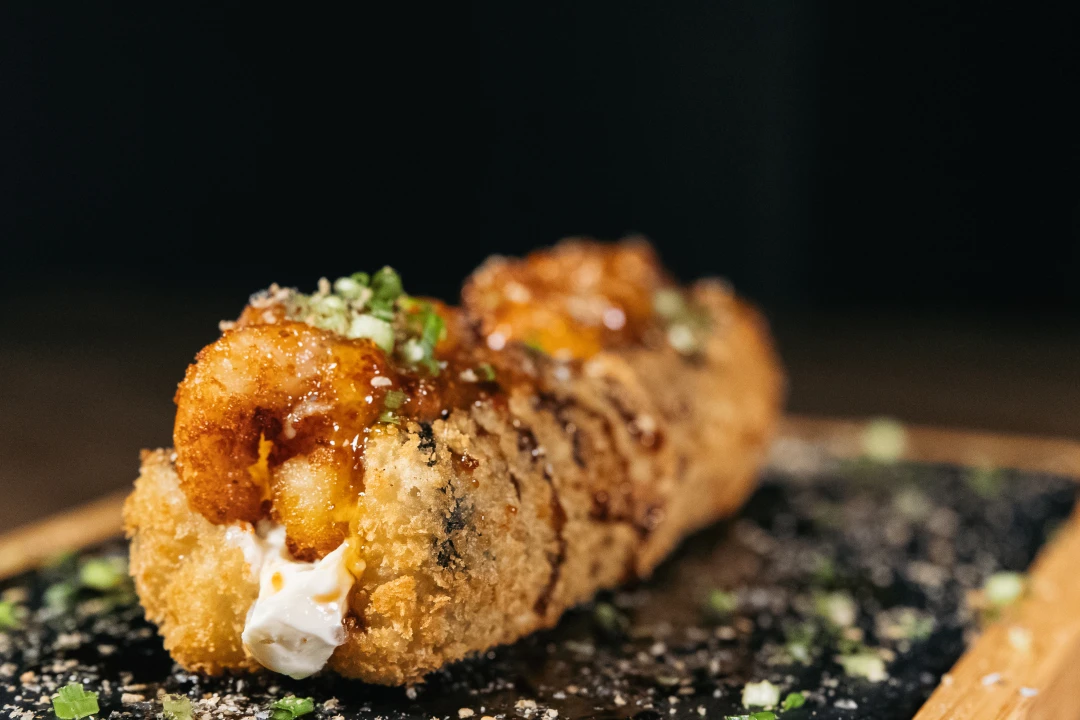 Este é o nosso incrível hot de camarão empanado, super crocante. Veja de perto como ele é preparado: