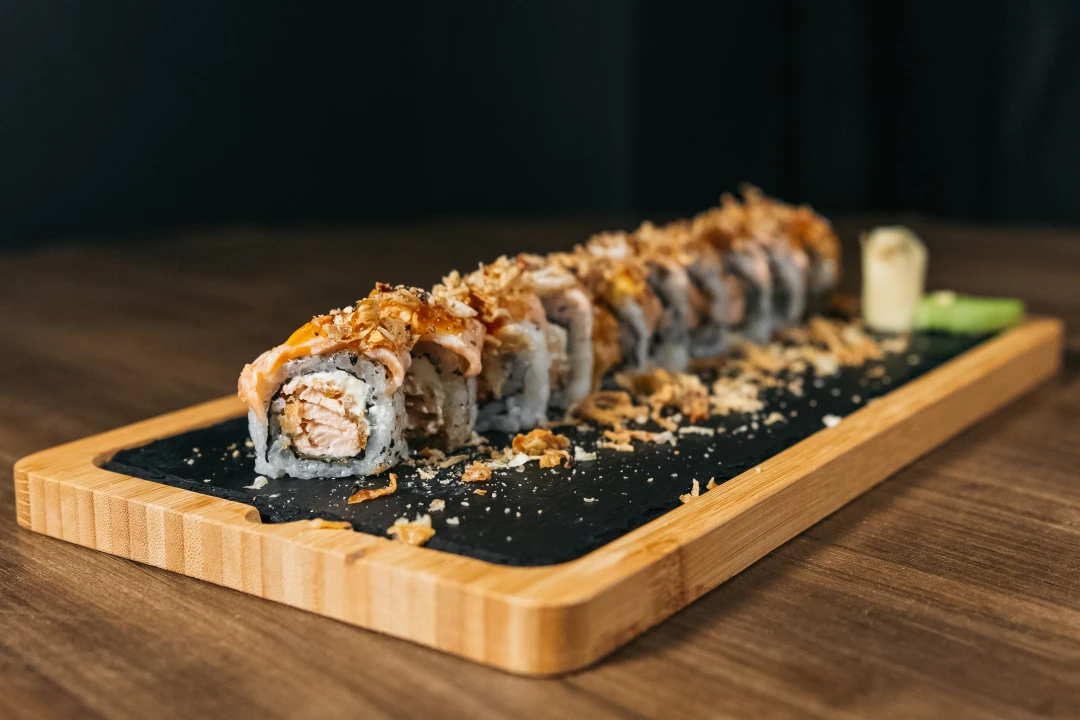 Enrolado de arroz recheado com salmão empanado crocante e cream cheese, coberto por salmão maçaricado. Finalizado com geleia de pimenta e cebola crispy.